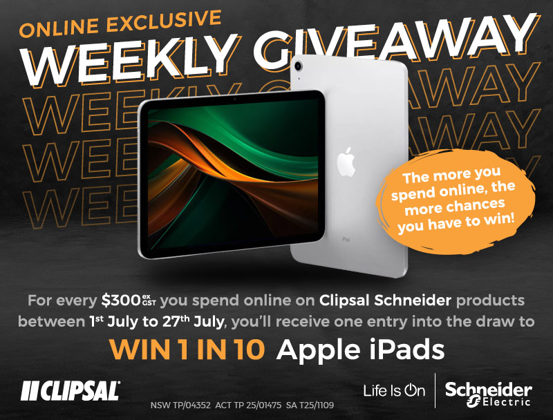 For every $300 exc GST you spend online on Clipsal Scheneider products, you'll receive one entry into the draw to win 1 in 10 Apple iPads